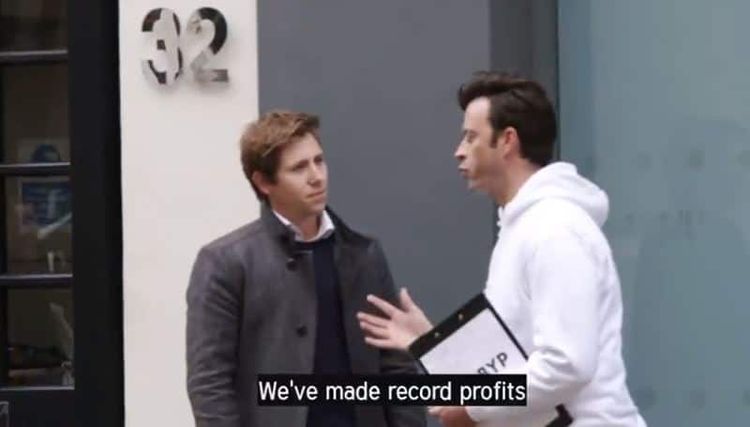 In a new comedy sketch released in time for Shell’s AGM on Tuesday, satirist Jolyon Rubenstein pretends to be a representative of the fictional charity We’re Richer Because You’re Poorer and hands out 22p to members of the British public.