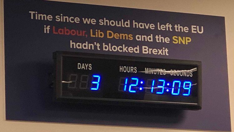 Following an extension October 31’s Brexit deadline, a message above the clock now reads: “Time since we should have left the EU if Labour, Lib Dems and the SNP hadn’t blocked Brexit.”