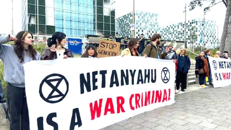 Campaigners from the Extinction Rebellion group took over a bridge in front of The Hague-based court just after noon, carrying a banner that read “Netanyahu is a war criminal”.