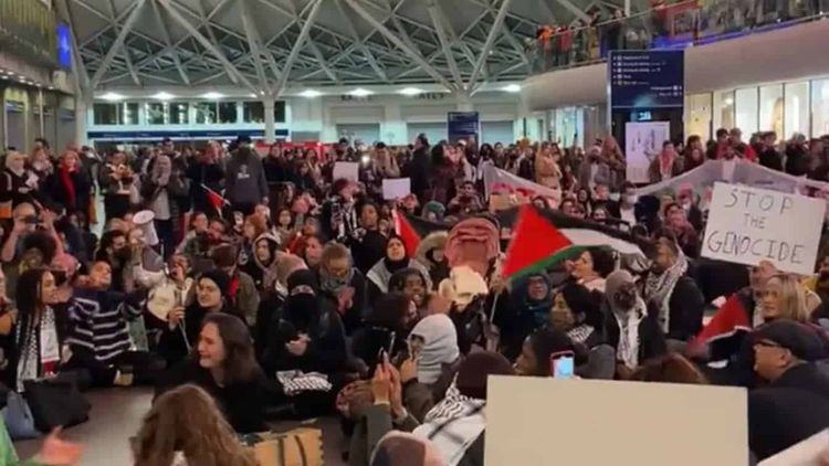 In videos, protesters can be seen sitting on the station concourse chanting “ceasefire now”, “free, free Palestine” and “in our thousands, in our millions, we are all Palestinians”.