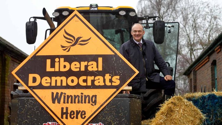 Sir Ed Davey joked that “heavy machinery” would be required to clean up the “mess” left by the Conservatives as he took a ride in a tractor to launch his local election campaign.