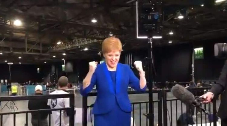 Having urged her followers to take some “deep breaths” as the game went to penalties, Sturgeon hailed Scotland’s landmark victory by posting a GIF of her celebrating the SNP’s unseating of Jo Swinson, the former Liberal Democrat leader, in last December’s general election.