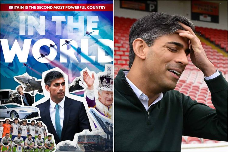 Featured in the picture collage was a picture of the England football team alongside a prime minister with record low ratings, a Swiss-owned container ship, a US fighter jet and a large image of a smiling King.