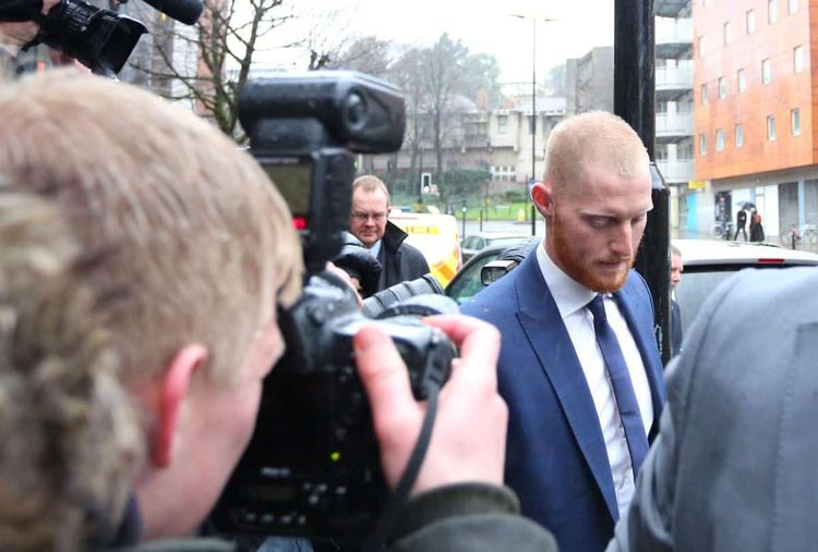 Stokes, wearing a blue skinny suit with a shaved head, was mobbed by a scrum of photographers and camera crews as he climbed the steps to the court.