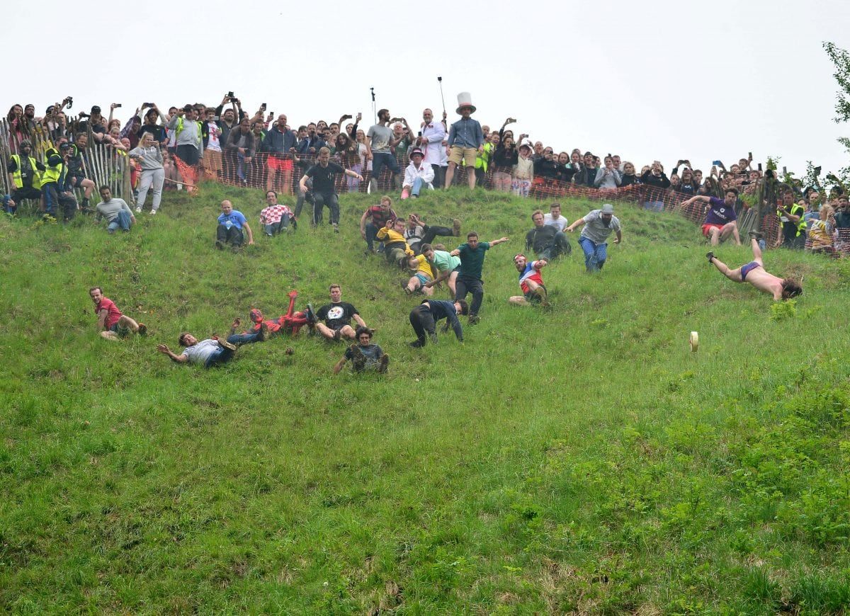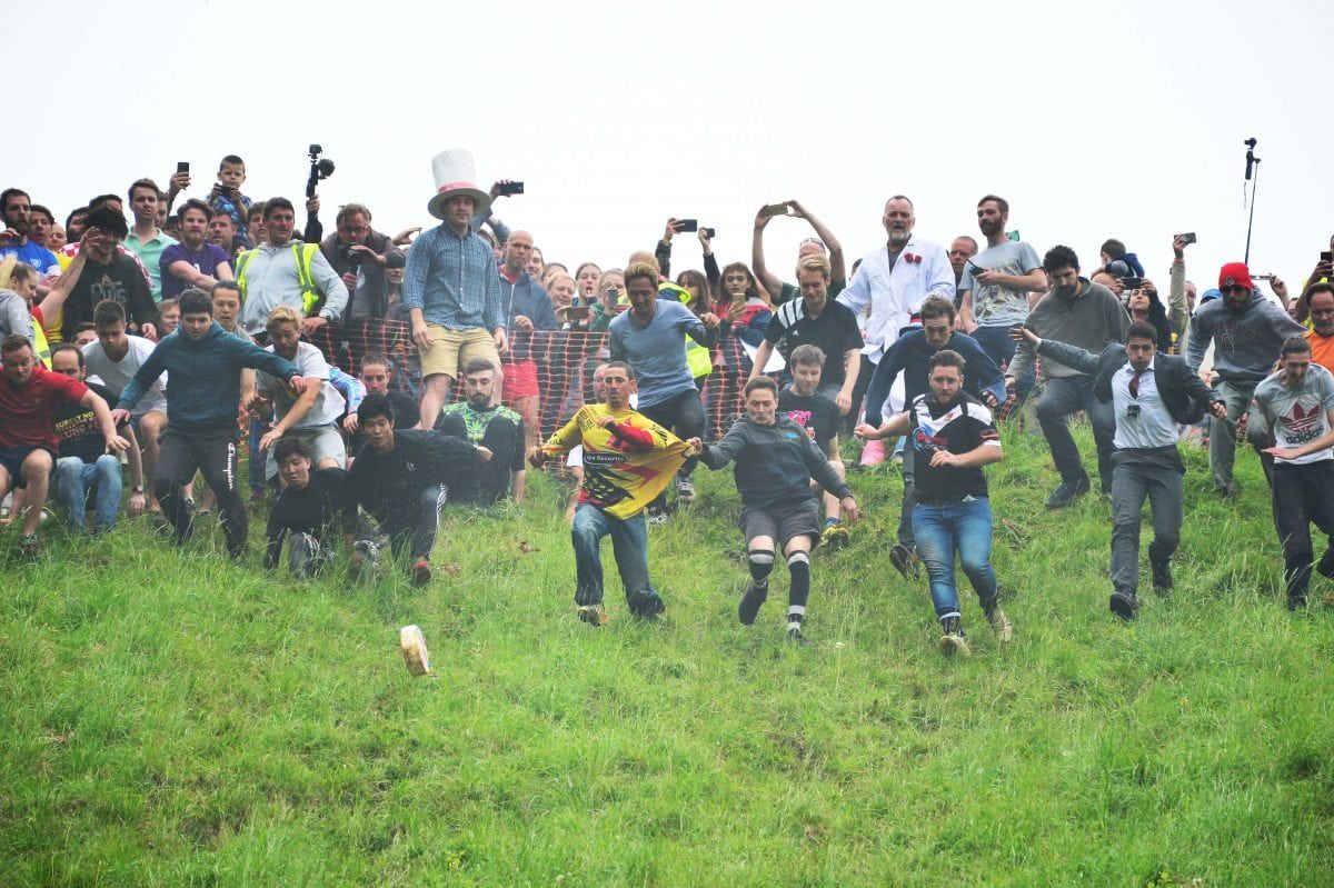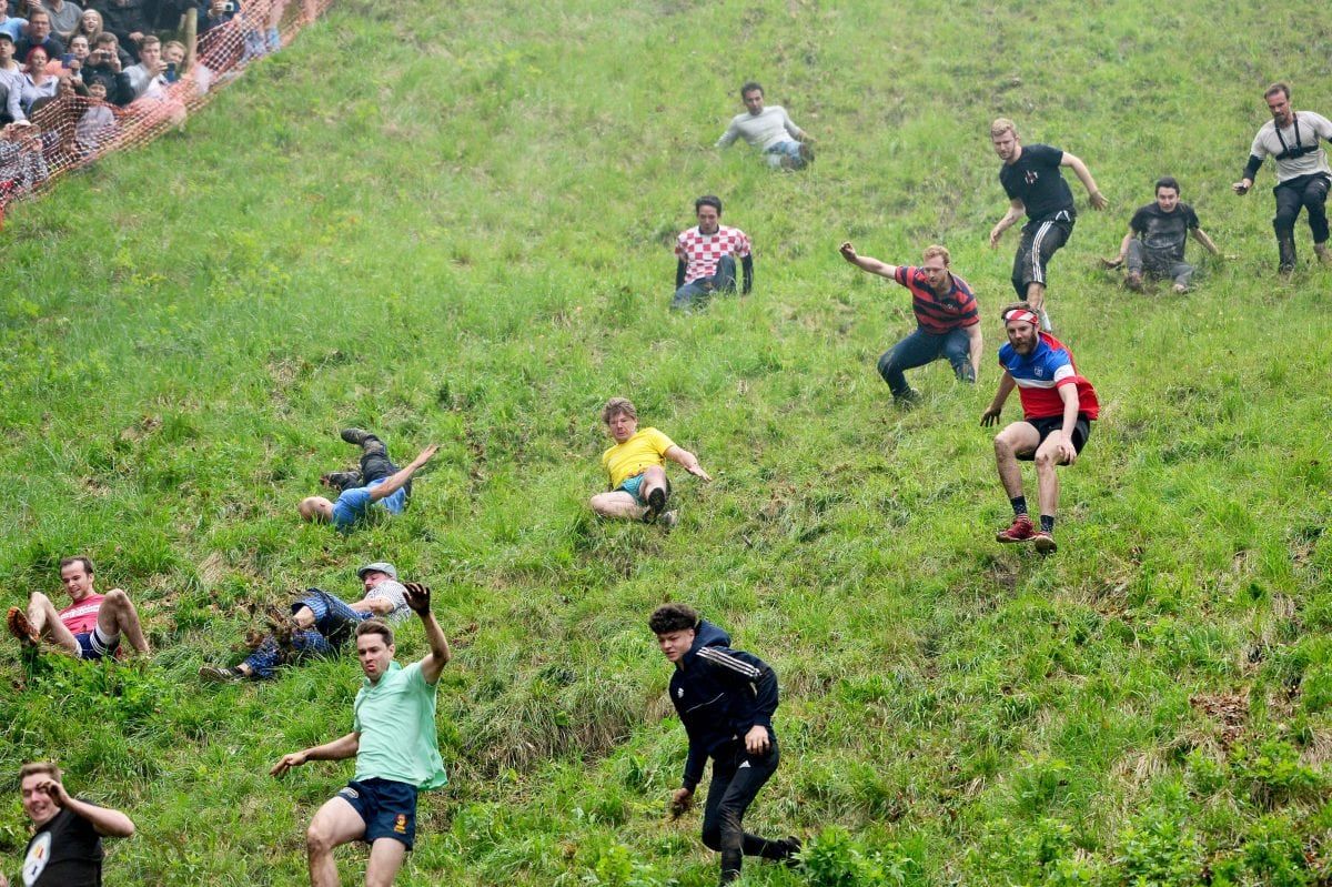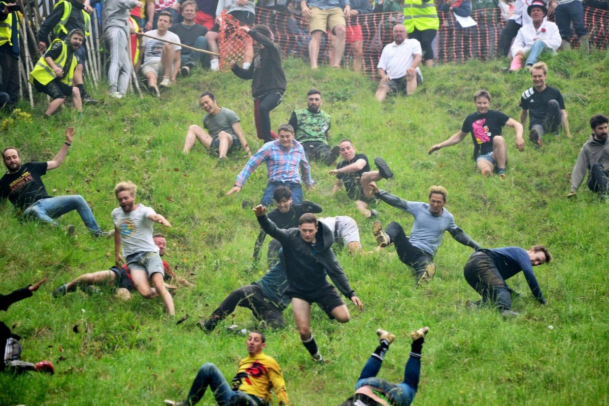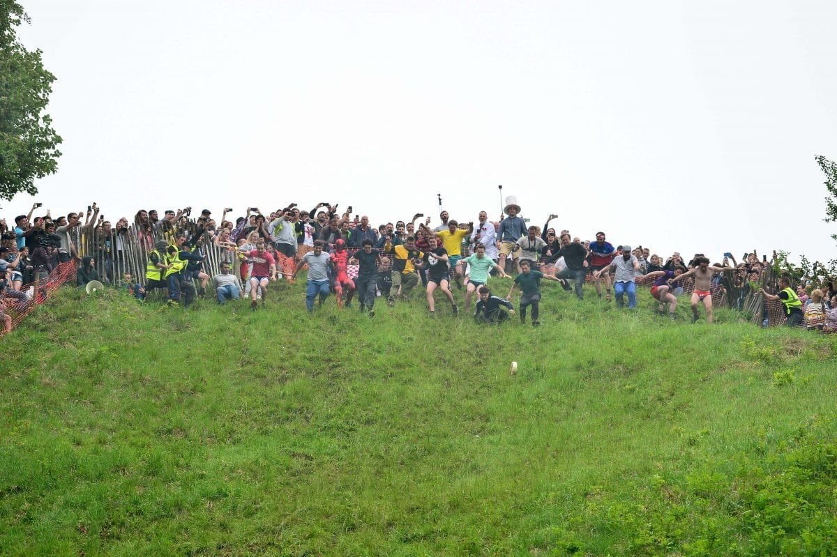 Thousands gathered to watch one of Britain’s wackiest sporting events, where runners sprint (and tumble) after a heavy cheese that goes hurtling down a steep hill at break-neck speeds.