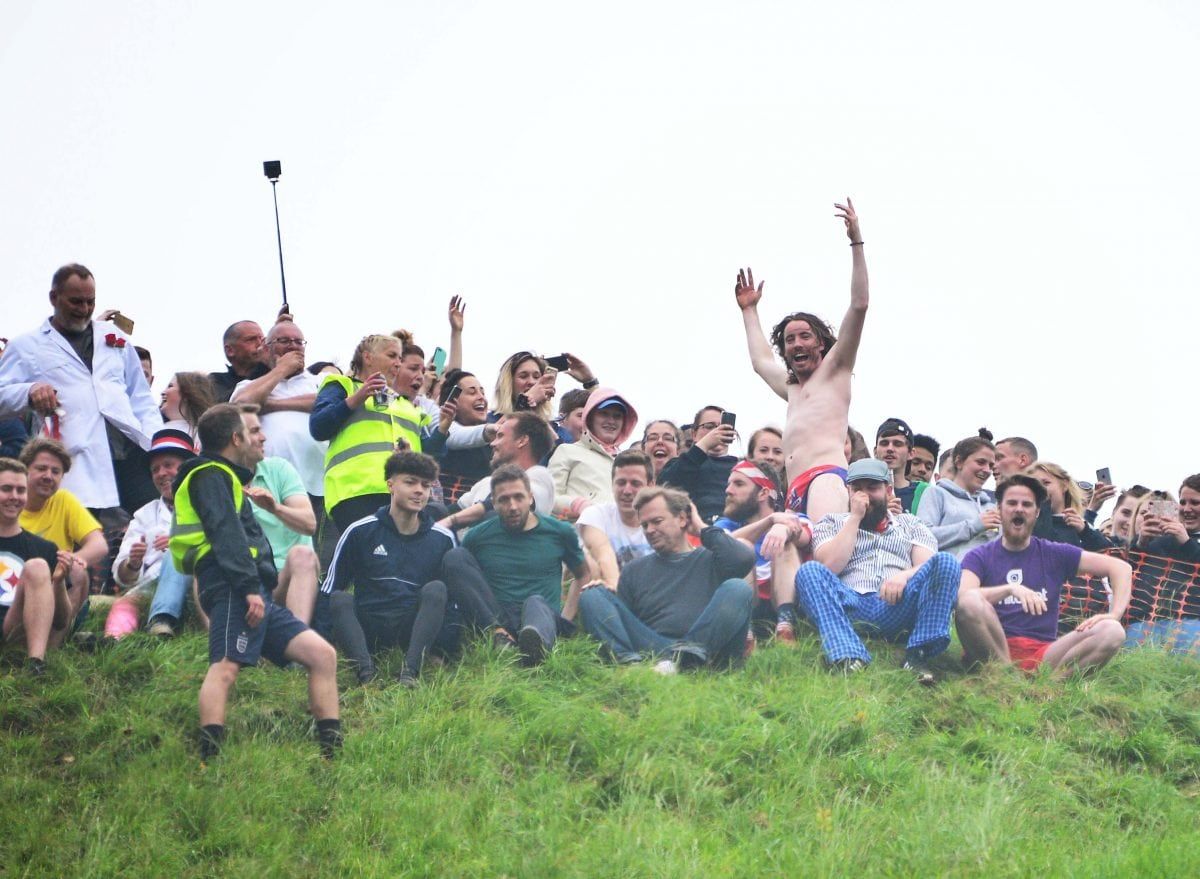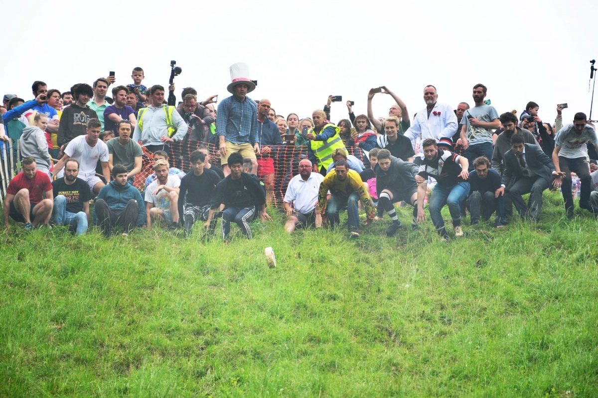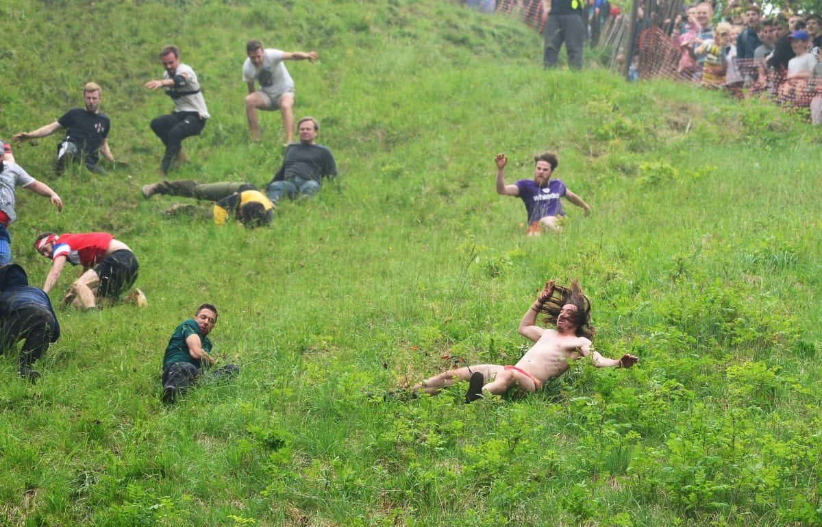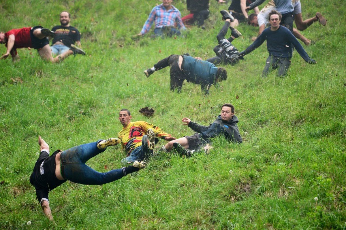Thousands gathered to watch one of Britain’s wackiest sporting events, where runners sprint (and tumble) after a heavy cheese that goes hurtling down a steep hill at break-neck speeds.