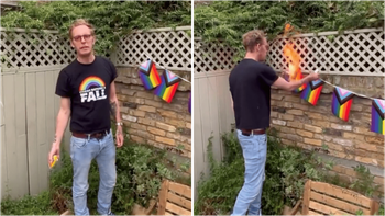Fox says he hopes that the police do pay him a visit, describing the Pride flags as an "icon to child mutilation".