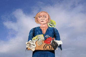 The figure is also clutching a cardboard box containing a goodbye card, a copy of Guinness World Records and a copy of her mini-budget.