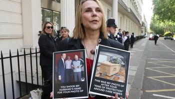 Protesters greeted the former health secretary outside the inquiry building, with one holding a sign saying: 'You shook my husband’s hand for your photo op'.