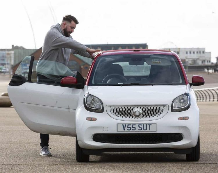 Towering Lydon Sutcliffe, 32, makes his colleagues laugh each morning when he drives into work – after squeezing his huge frame into his mum’s 60-inch high Smart Fortwo.