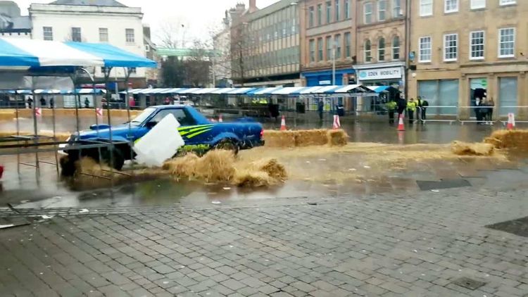 This is the moment Freddie Flintoff smashed a pick-up truck into a market stall while racing his Top Gear co-hosts around a town centre.