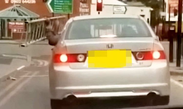 The unnamed cabbie was captured travelling along a road while two men in the front and back seats dangerously held the ladder alongside the vehicle.