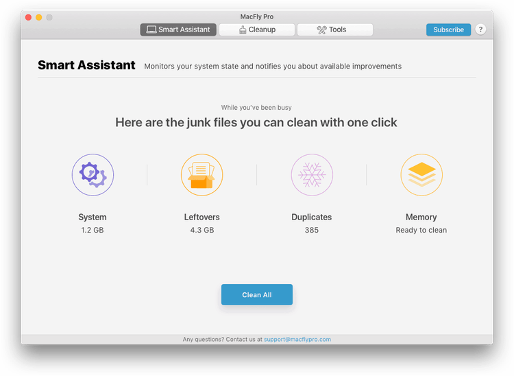 MacFly Pro is a versatile suite of utilities – not unlike a Swiss army knife. Do not be alarmed, the numerous features are grouped quite handily into tree modules: Smart Assistant, Cleanup and Tools.