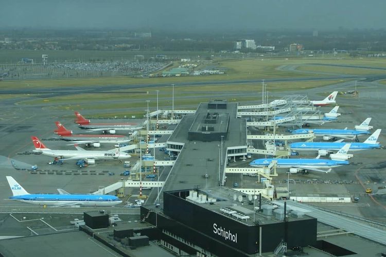 London Heathrow today cancelled ten per cent of flights in and out of the airport and Schiphol cancelled 90 due to strong winds.